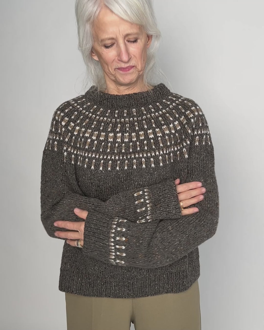 Der videoguides til alle teknikkerne i opskriften, så du kommer sikkert i mål. Sweateren strikkes i vores Tweed kombineret med Highland, som anvendes til én af kontrastfarverne.