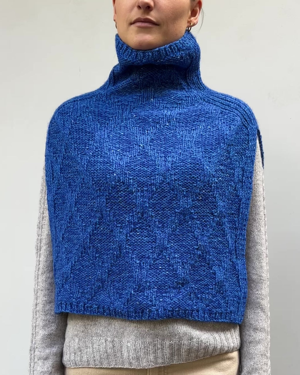 Fyn Halsedise strikkes oppefra og ned i strukturmønster og rib. Først strikkes den høje hals med rib i hver side. Derefter deles arbejdet, og for og bagstykke strikkes frem og tilbage hver for sig, stadig med rib i hver side.