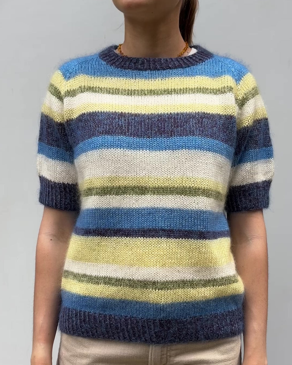 Langø T-shirt strikkes oppefra og ned i glatstrik og striber i forskellige garnkvaliteter. Først strikkes bærestykket med raglanudtagninger, mens halsen formes. Derefter deles arbejdet, og krop og ærmer strikkes hver for sig. Til slut strikkes der kanter i drejet rib.